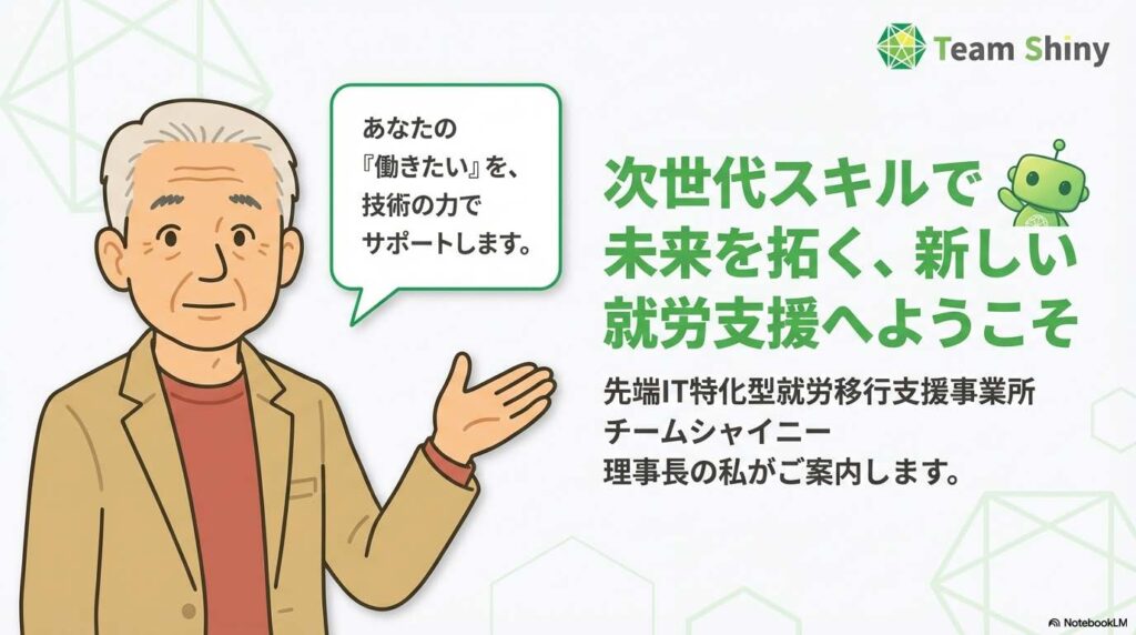 チームシャイニーは、AIエンジニアやデータサイエンティストを目指す利用者に向けた特化型の就労移行支援事業所です。