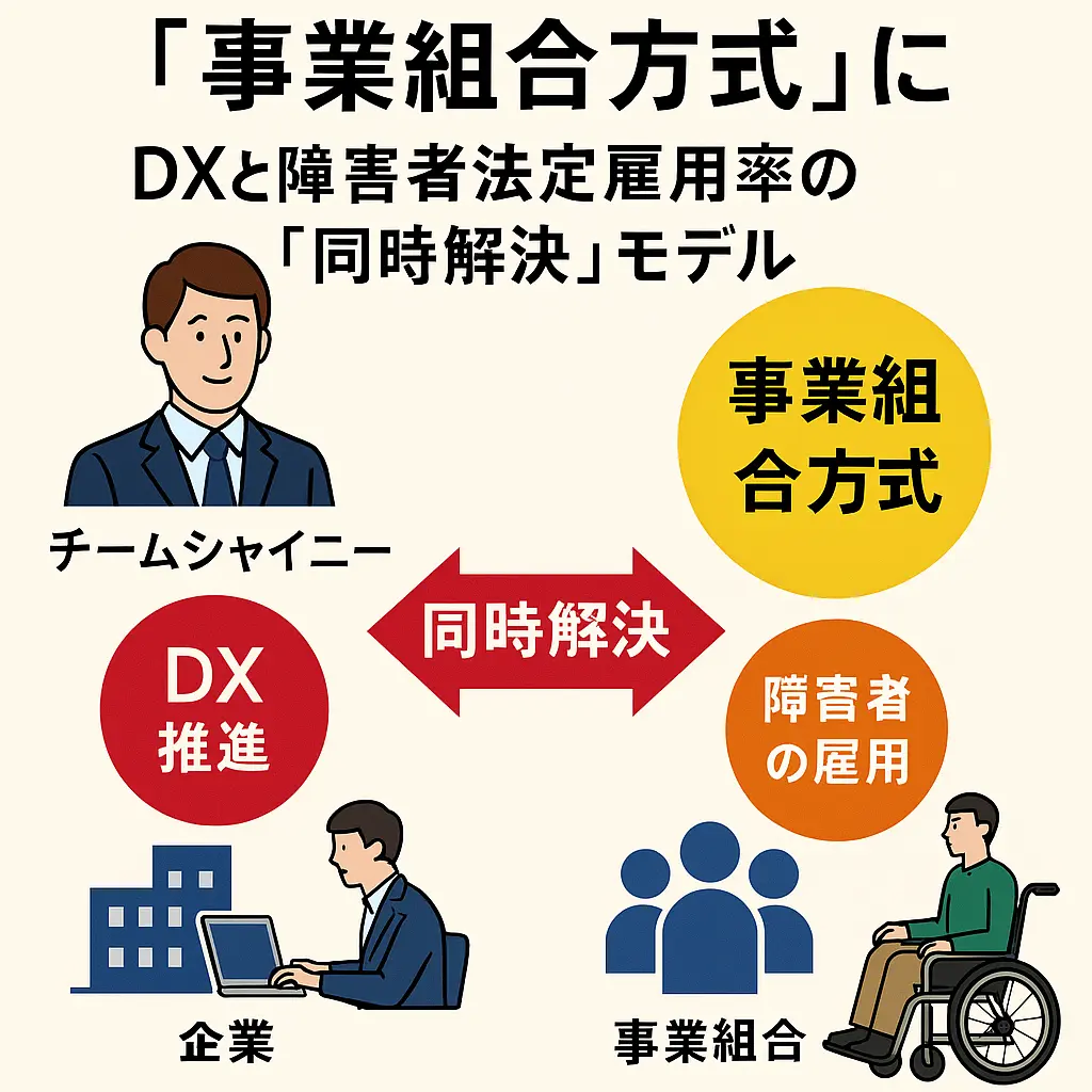 チームシャイニーが推進する「事業組合方式(LLP)」は、中小企業のDX推進と、障害を持つ方々の高度な専門性を活かした雇用創出を同時に実現するモデルです。