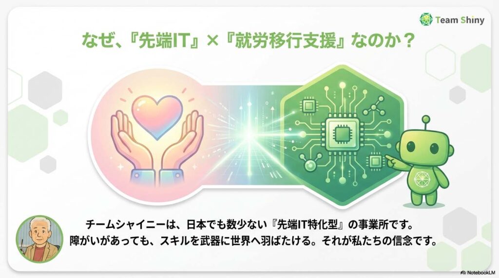 無料相談はこちら blog 就労移行支援で見つける自分らしい働き方 この記事を書いた人 吉見祐次 NPO法人「発達障がい者を支援する会」理事長。私たちは “Make the World for Gifted People” を掲げ、凸凹(特性)を無理に均すのではなく、活きる方向へ伸ばす支援を続けています。AI・データサイエンス特化の就労移行支援「チームシャイニー」では、未経験からでも学び直しができる環境を整え、仲間と協力しながら「実績」を積み上げ、就職・定着までつなげます。記事では、当事者・ご家族・企業の方に向けて、現場で役に立つ情報を分かりやすくまとめます。 関連記事 就労移行支援で見つける自分らしい働き方 2026年2月14日 オリジナルPV作ってみました by 市原 早映 2026年2月13日 AIは「苦手」を「得意」に変える魔法の道具! 2026年2月11日 AIに仕事を奪われる時代の新・生存戦略|障害特性を武器に、超暇時代を自由に生きる 2026年2月10日 チームシャイニー/シャイニーラボ・スタッフ紹介(英知) 2025年10月23日 発達障害と(ニューロダイバーシティ)とは何かとその意義 2025年9月16日 【2025年版】「障害者×生成AI」で仕事はこう変わる!事例から学習法まで徹底解説 2025年9月5日 【ADHD向け】特性を活かすメモアプリ5選|忘れっぽい人・タスク管理が苦手な人をサポート 2025年9月1日 コメント コメントする コメントをキャンセルコメント ※ 名前 ※ メール ※ サイト 次回のコメントで使用するためブラウザーに自分の名前、メールアドレス、サイトを保存する。 Δ